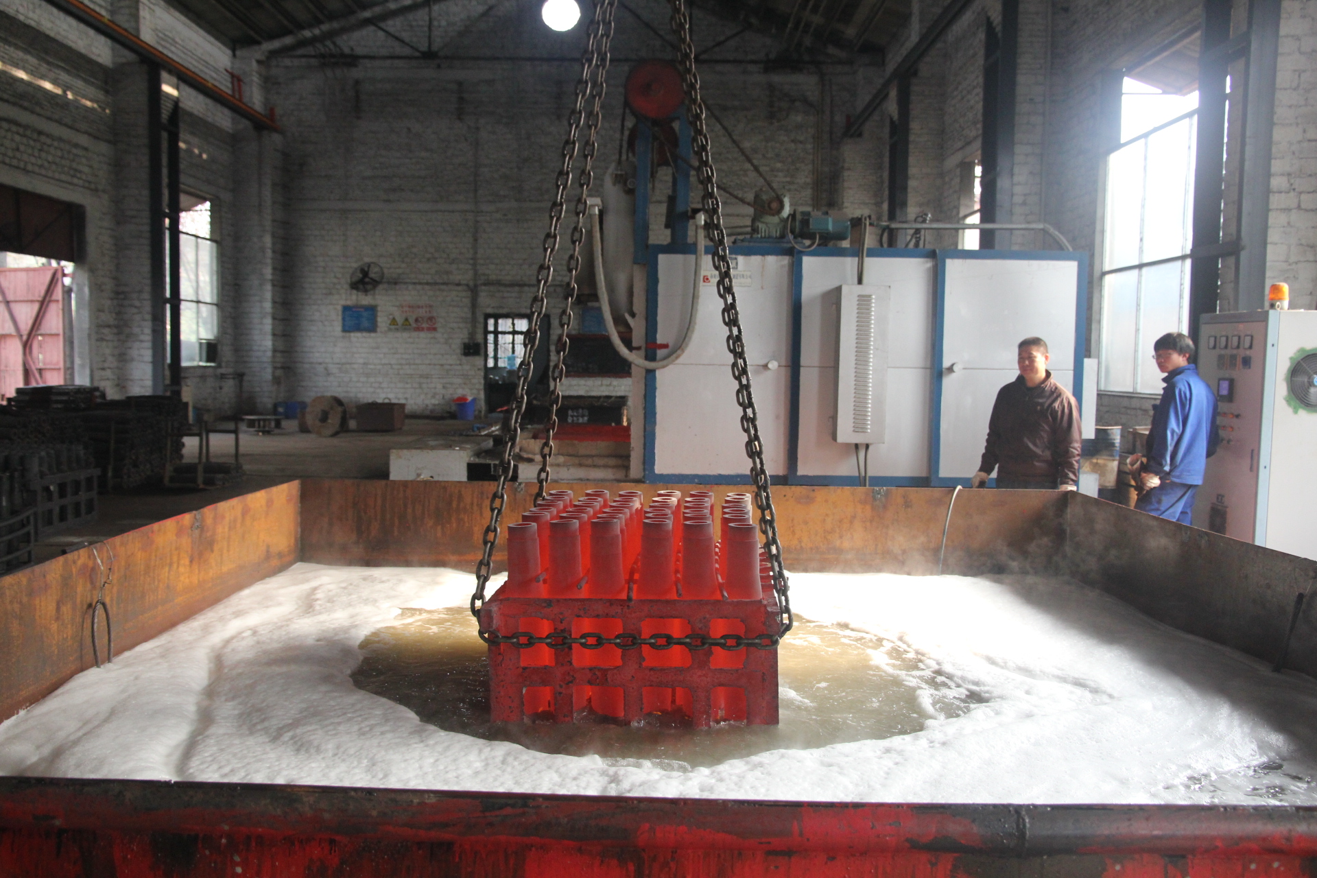 ▲ 擁有臺車式電加熱爐、箱式電阻爐、碳勢自動控溫井式滲碳爐、高頻淬火設(shè)備、吊掛式旋轉(zhuǎn)拋丸機(jī)、大型PAG循環(huán)淬火液池、循環(huán)NACL水溶液淬火池、金相及硬度檢測設(shè)備。